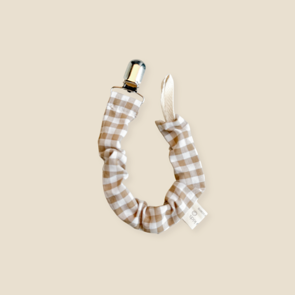 Confeccionado en tela, cuenta con una hebilla metálica que se sujeta fácilmente a la ropa, mantiene el chupete siempre a mano y evita que se pierda o caiga.