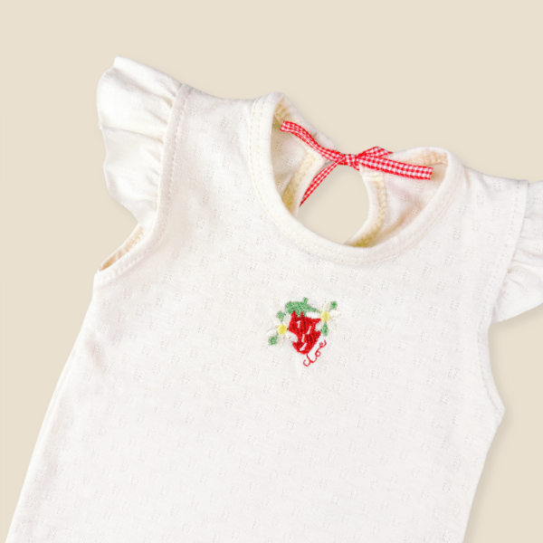 Bordado en la delantera, con una frutillita, que ademas, combina con la cinta vichy que tiene en la espalda, para hacer un moñito.