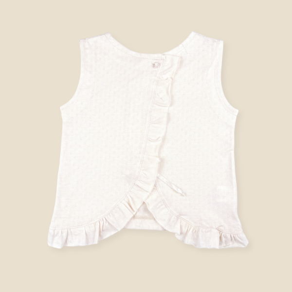 La parte trasera cruzada con voladitos le da un toque único que enamora.