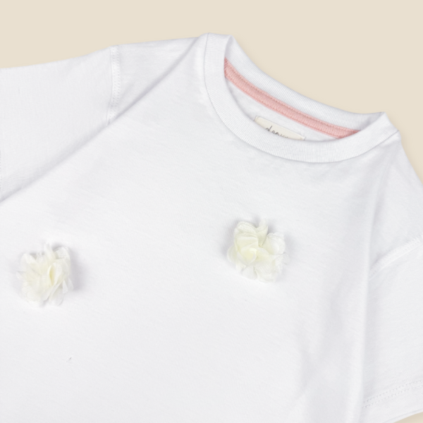 Con flores de gasa cosidas una por una en la delantera.