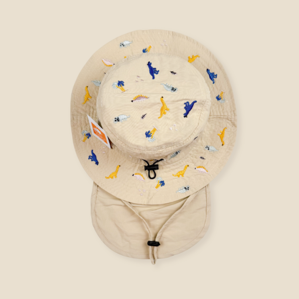 Está confeccionado en tela liviana, respirable e impermeable, con protección solar UV50, visera ancha y una solapa trasera que cubre la nuca, perfecta para días de playa, campo o paseo.