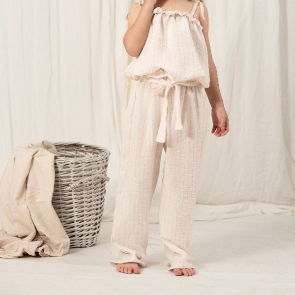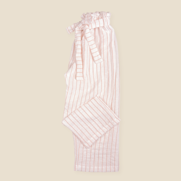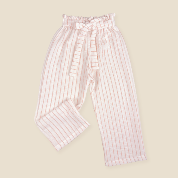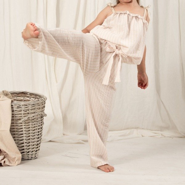 Un palazzo amplio y liviano, con cintura elástica y lazo para anudar, que combina comodidad con un estilo dulce y delicado.