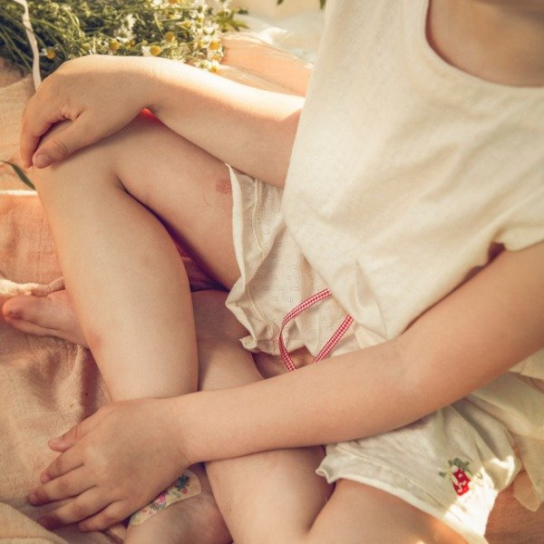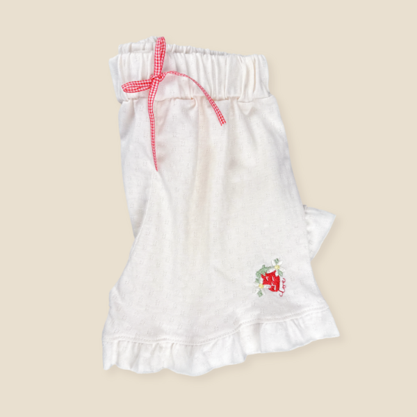 Bordado en la delantera, con una frutillita, que ademas, combina con la cinta vichy que tiene en la cintura, para hacer un moñito.